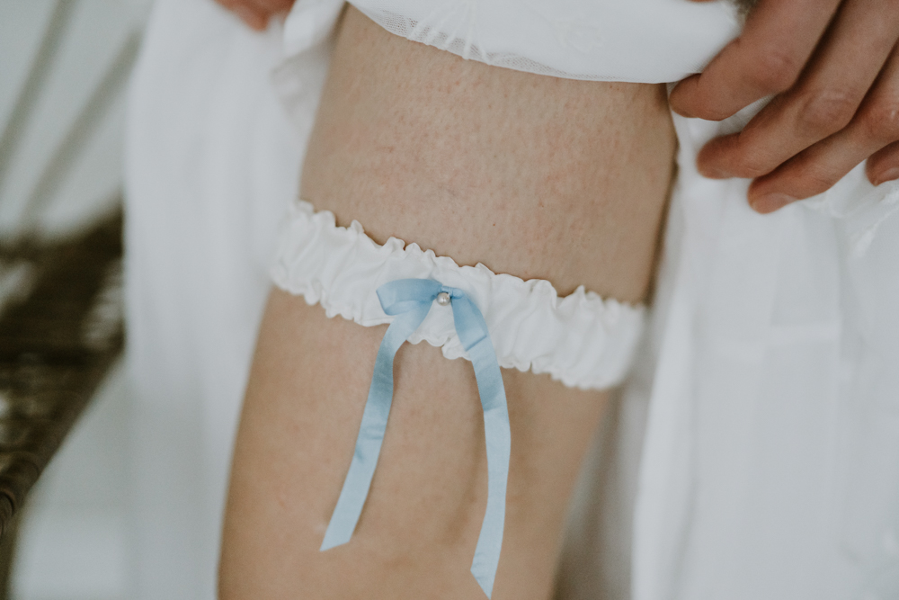 - Pure silk garter in ivory with blue silk bow and pearl bead
