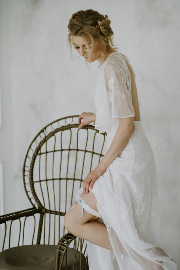 Victoria is a beautiful silk wedding garter with a blue bow. The ivory silk garter is edged with a pretty embroidery stitch and embellished with a delicate blue silk bow and pearl bead.
